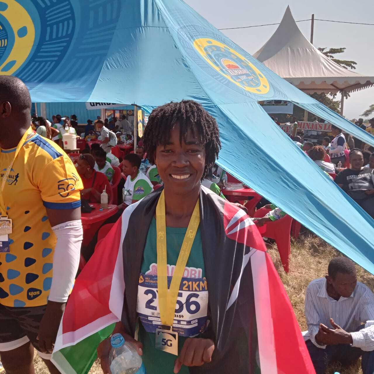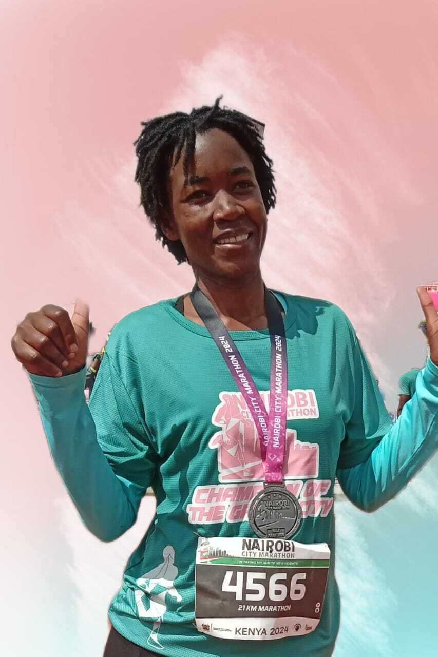 Brenda has completed three half marathons: the Nairobi City Half, the Standard Chartered Half, and the Kilimanjaro Marathon. Kilimanjaro was her proudest moment—her coach set a two-hour goal, and she crossed in 1:58.